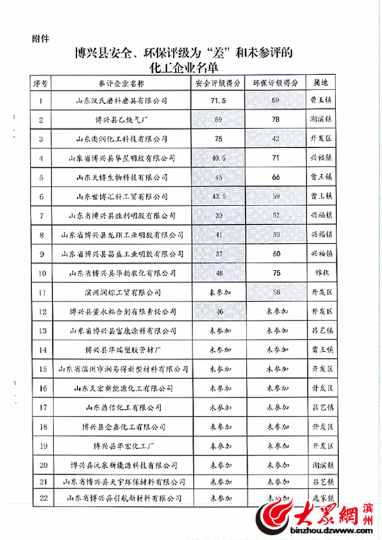 于淋凡)根據濱州市化工產業安全生產轉型升級領導小組辦公室《關于嚴格貫徹落實魯化安轉辦【2017】1號文件的通知》(濱化安轉辦【2017】1號)要求。7月初,博興縣政府決定對全縣環保、安全結果為“差”的企業和未參加“評級評價”的22家化工企業(名單附后)進行停產整改。